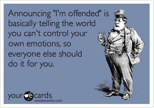 Dit is een emotie die ik geheel niet begrijp. Niet omdat ik de betweter uit wil hangen, maar omdat ik een redenatietrant die uitkomt op de melding "I'm offended" gewoon niet kan volgen. Misschien omdat het een typisch passief-agressief verwijtje is en de oorzaak van het 'krenken' verder niet adresseerd. Ik denk dat je 'offenden' je laat gebeuren, en dus je eigen schuld is.
